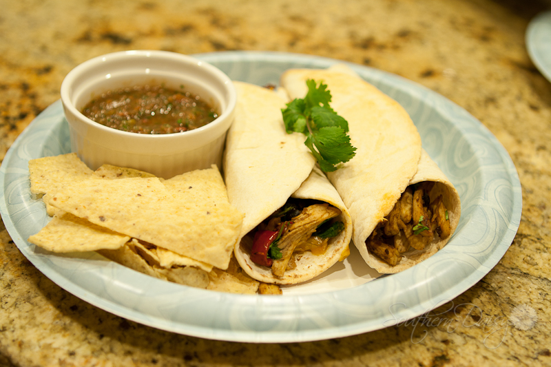 Add some of the chicken and black bean mixture to the tortilla. Remember that you’re going to be rolling these, so don’t over fill it.